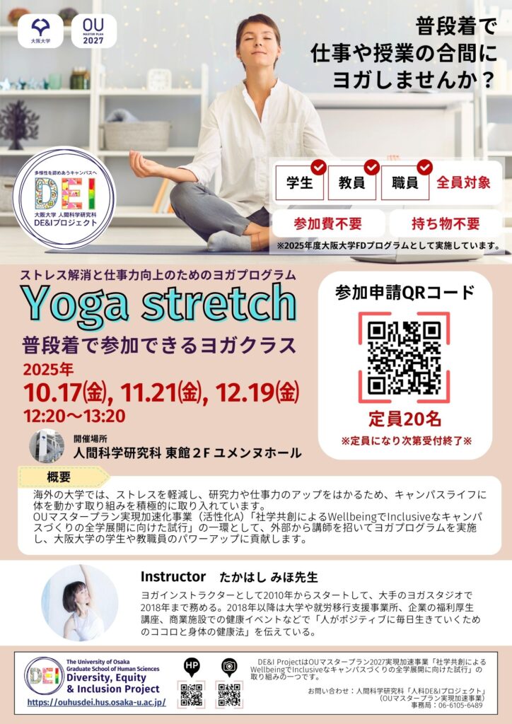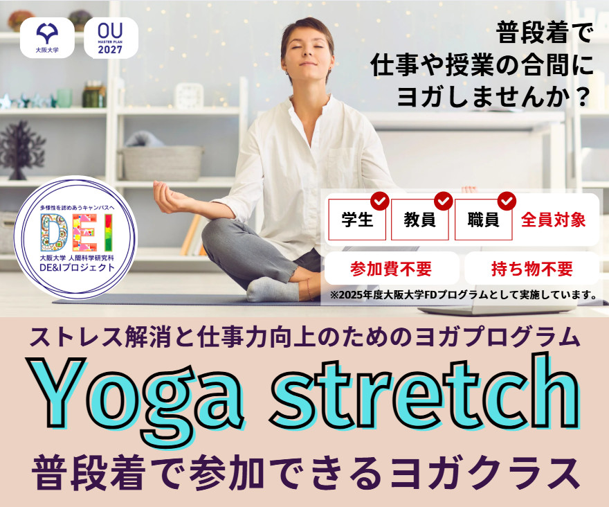 概要:海外の大学では、ストレスを軽減し、研究力や仕事力のアップをはかるため、キャンパスライフに体を動かす取り組みを積極的に取り入れています。OUマスタープラン実現加速化事業(活性化A)「社学共創によるWellbeingでInclusiveなキャンパスづくりの全学展開に向けた試行」の一環として、2025年10~12月に月1回、外部から講師を招き、ヨガプログラムを実施し、大阪大学の教職員および学生のパワーアップに貢献します。